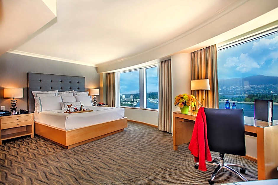 This spacious room offers a 42" LCD TV, iPod dock, fully stocked mini-bar, coffee maker, and a digital safe. A seating area and work desk are provided. The private bathroom includes Italian marble and free toiletries. A view of the Vancouver harbor and coastal mountains is enjoyed.